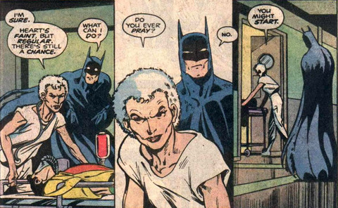 The weakest of weak story writing. The power Leslie's death erased in a panel. Turns out every year, on his birthday, Bruce hooks himself up to a computer and runs a simulation...it gets harder every year but it's still a simulation. I never wanted to throw a book across the room so badly as this. The disappointment was almost as intense as the real emotional connection I had with the material the night before.